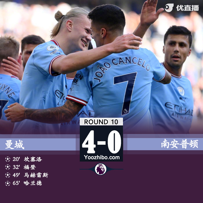 直播车讯北京时间10月8日22:00,2022-23赛季英超联赛第10轮,曼城坐镇伊蒂哈德球场迎战南安普顿。上半场哈兰德单刀球中柱,坎塞洛建功,福登破门,曼城暂2-0南安普顿。下半场马赫雷斯进球,哈兰德再失单刀,随后他接到坎塞洛助攻取得进球,曼城4-0南安普顿。