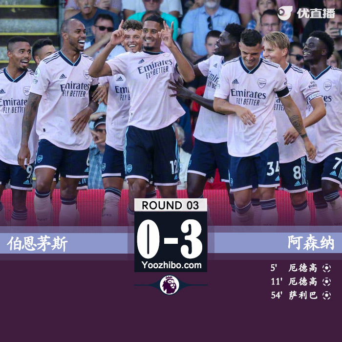 直播车讯北京时间8月21日00:30,英超第3轮,阿森纳客场对阵伯恩茅斯。上半场,热苏斯一条龙策动进攻,厄德高补射破门,巴西人随后助攻厄德高双响;下半场,萨利巴打入处子球,热苏斯破门但越位在先。最终,阿森纳3-0击败伯恩茅斯,取得3连胜暂时登顶积分榜。