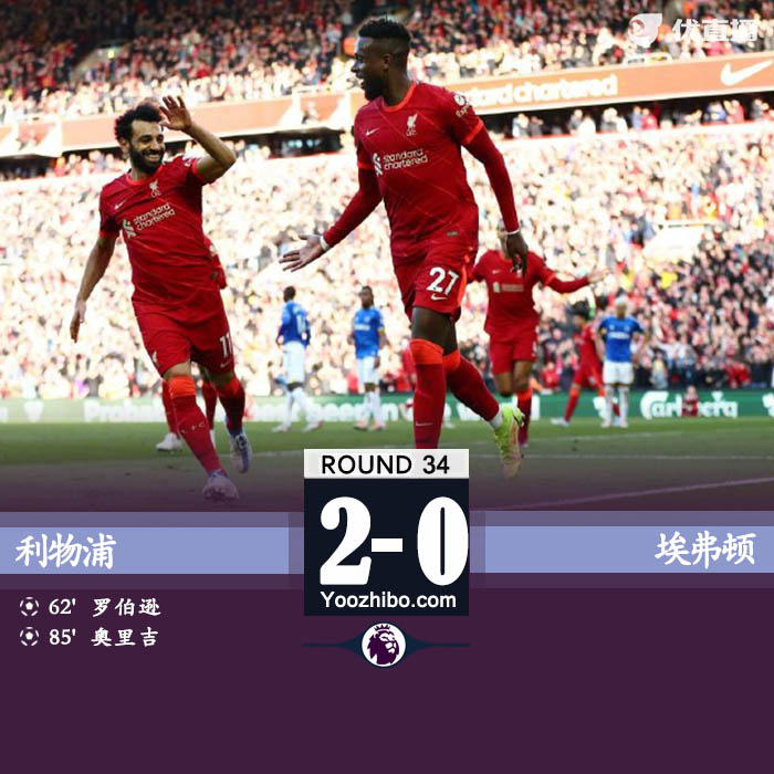 直播车4月25日讯 北京时间4月24日23时30分,2021-2022赛季英超第34轮上演一场默西塞德德比战,利物浦主场迎战埃弗顿。上半场双方均无建树,利物浦半场0-0战平埃弗顿。下半场,萨拉赫助攻罗伯逊首开纪录,替补登场的奥里吉破门锁定胜局。最终利物浦主场2-0击败埃弗顿,取得联赛两连胜。此役战罢,利物浦继续排名第二,依旧落后领头羊曼城1分。