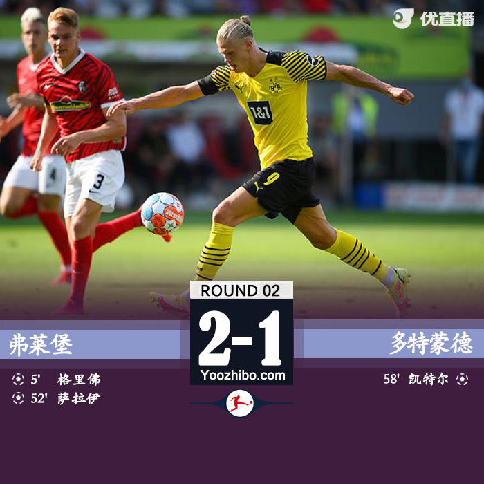 直播车8月21日讯 北京时间8月21日21:30,德甲第2轮,多特蒙德做客挑战弗赖堡。上半场,格里福任意球世界波直挂死角,贝林厄姆精彩突破造险后又头球中柱,郑优营门前失良机。下半场,萨莱凌空垫射扩大比分,帕斯拉克造蒂尔乌龙扳回一城。全场比赛结束,弗赖堡主场2-1击败多特蒙德。