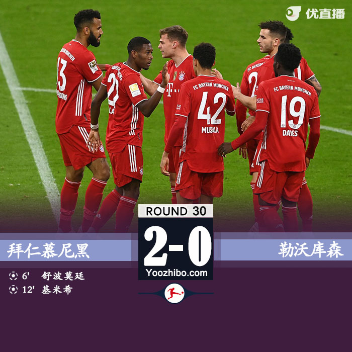 直播车4月21日讯 北京时间4月21日凌晨2时30分,2020-2021赛季德国甲级联赛第30轮上演一场焦点战役,拜仁慕尼黑坐镇安联球场迎战勒沃库森。上半场,舒波-莫廷破门首开纪录,基米希扩大领先优势。拜仁半场2-0领先勒沃库森。下半场,舒波-莫廷打进一球,但是被判罚越位在先,随后替补上场的贝拉拉比有一次射门击中横梁。最终拜仁慕尼黑主场2-0击败勒沃库森。本轮战罢,拜仁继续排名榜首,领先第二名10分,本赛季德甲还剩下4轮。