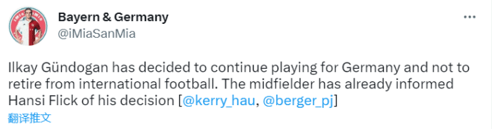 直播车讯03月05日据德国媒体SPORT1记者KerryHau报道,京多安不会从德国国家队退役。