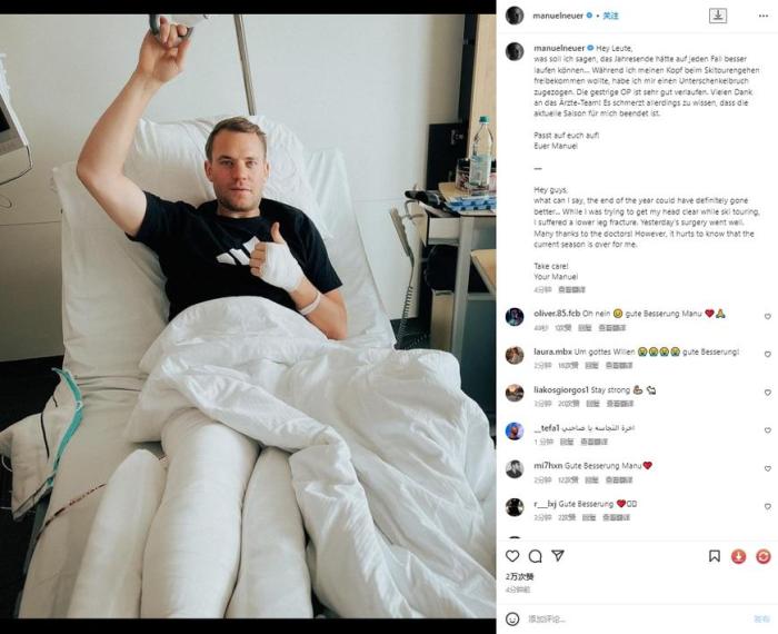 诺伊尔在个人社交账号上写道:“大家好,我都不知道该怎么说了,今年的最后一段时间肯定没法更糟糕了...世界杯出局后,我在滑雪的时候想让头脑清醒一下,结果把小腿给摔断了。昨天的手术很顺利,很感谢医生!但这个赛季对我来说已经结束了,很难过得知这一点。大家保重!你的曼努埃尔!”