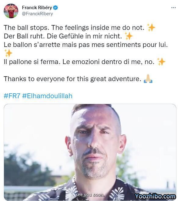 直播车10月22日里贝里在推特上用英文、法语、意大利语和德语写道:“足球停止了,但我心中的激情没有。感谢所有人陪伴我走过这段伟大的征程。”