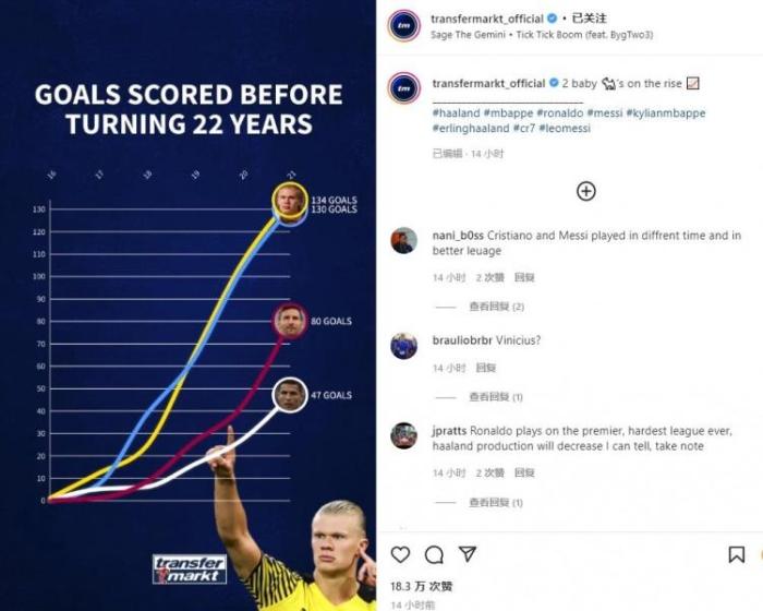 直播车05月14日讯 在22岁前,哈兰德打进了134球,姆巴佩打进了130球,远高于同期的梅西(80球),而C罗22岁前只打进了47球。