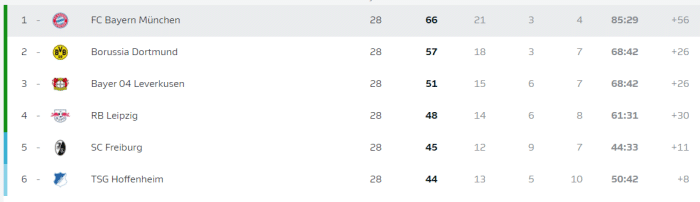 本轮多特1-4输球,拜仁4-1赢球,联赛还剩6轮,拜仁已经领先第二的多特9分,净胜球也多出30个,可能提前实现德甲十连霸。
