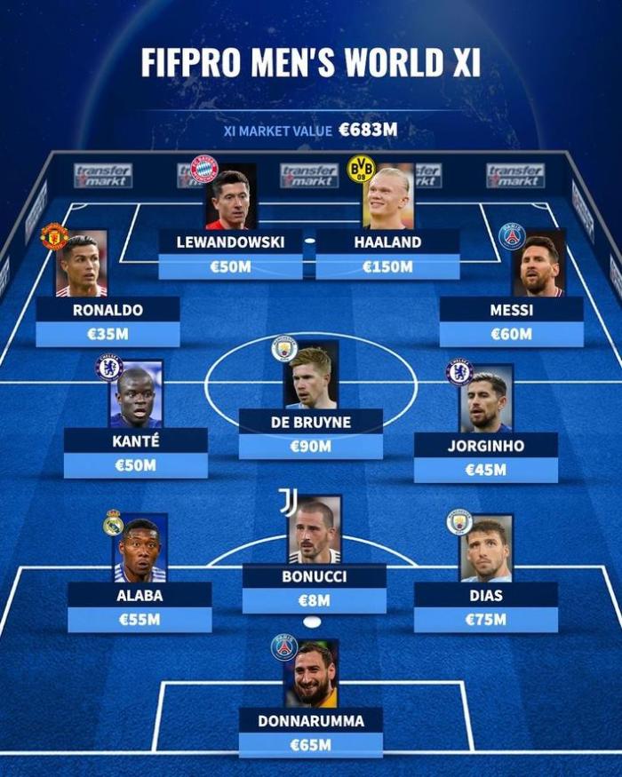 直播车01月19日讯 ,国际足联公布了年度最佳球员阵容,德国足球转会市场也统计了球员们的身价,哈兰德1.5亿欧元领衔,整份榜单身价高达6.83亿欧元。