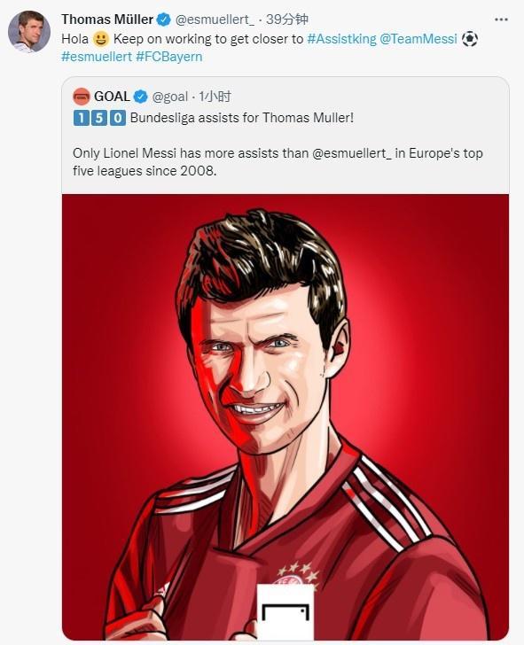 目前在五大联赛中穆勒的助攻次数仅次于梅西的180次。他在推特上写道:“继续努力以更接近梅西!”