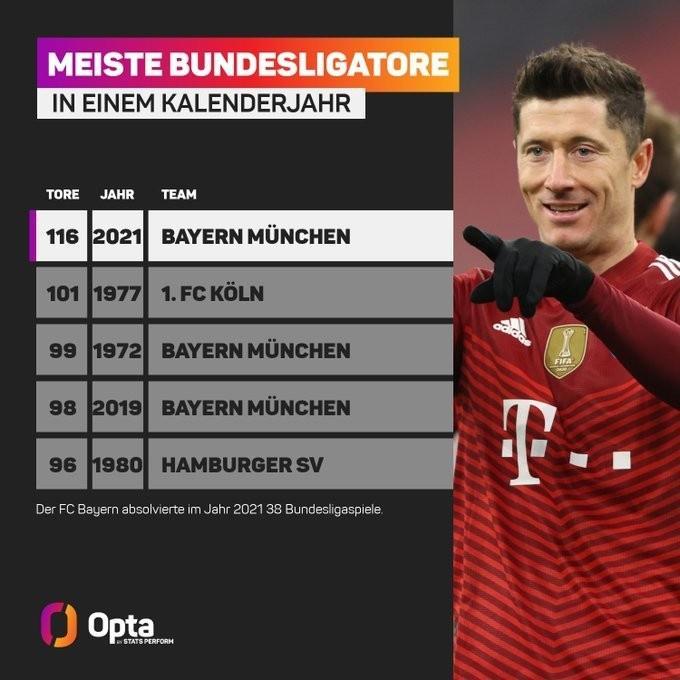 直播车12月29日讯 据OPTA数据统计,拜仁2021年在德甲联赛打进了惊人的116球,创造了德甲单个自然年的进球纪录。