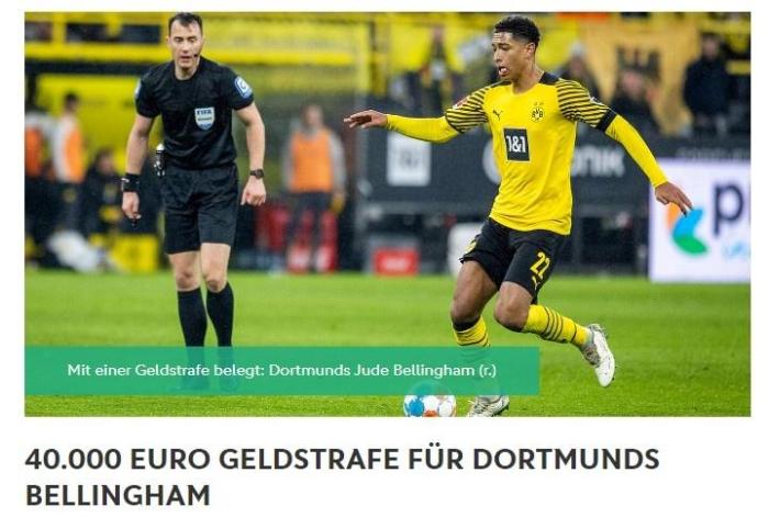 德国足协体育法庭指控贝林厄姆的行为违反体育道德,并对他罚款4万欧元,球员本人接受了处罚。