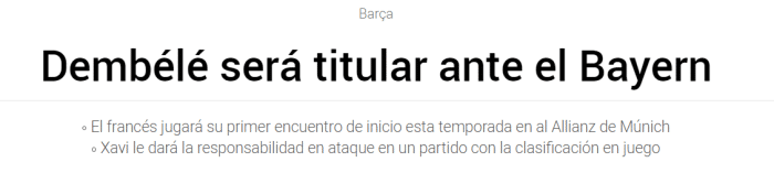 《每体》表示,哈维对登贝莱非常信任,最近三场巴萨的比赛,法国人都是替补登场,不过哈维认为在对阵拜仁的比赛中,巴萨需要依靠登贝莱的突破能力。