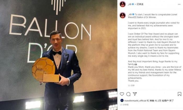莱万写道:“恭喜梅西和普特拉斯分别获得今年的男女足金球奖,也祝贺所有获得提名的球员。今年我赢得了最佳前锋奖项,没有团队和球迷的支持,没有人能够获得个人奖项,所以感谢大家!”