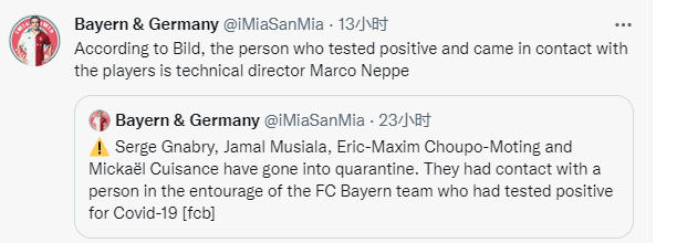 直播车讯 11月22日《图片报》消息,包括格纳布里和聚勒在内的多名拜仁球员因为新冠和密切接触被隔离。