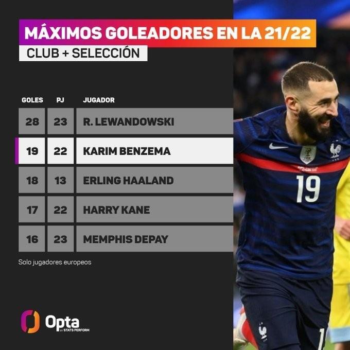 2、本泽马,22场19球