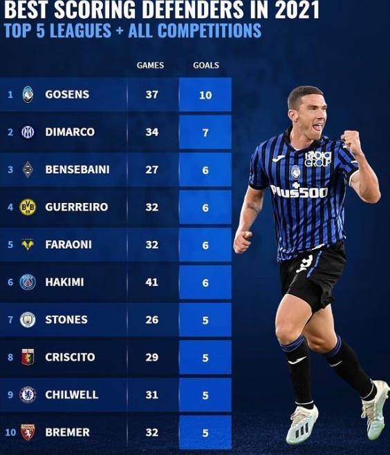 直播车10月30日讯 今日,德转统计了本年度五大联赛后卫各项赛事进球榜,其中,戈森斯第一。