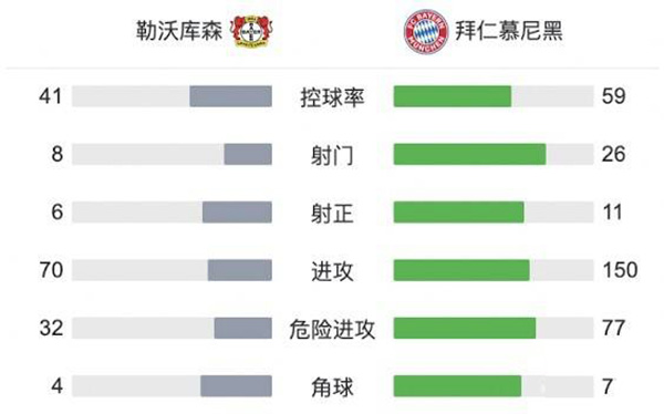 86分钟,阿德利扛住防守球员横传禁区,阿拉里奥推射破门,但他越位在先进球无效。89分钟,基米希内切一步一脚兜射打远角,球稍偏出。最终,勒沃库森1-5拜仁慕尼黑。