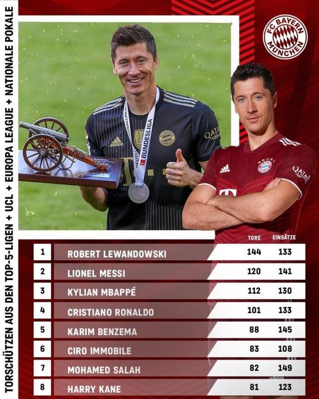 直播车讯8月22日消息,拜仁官网统计了2018年8月以来五大联赛各项赛事总射手榜,133场打进144球的莱万多夫斯基力压梅西位居榜首。