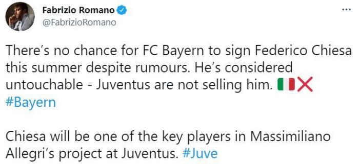 此前有消息称,拜仁想要引进小基耶萨。对此,知名记者罗马诺表示:拜仁没有机会签下小基耶萨,尤文将其视为非卖品。同时,小基耶萨会成为阿莱格里阵容中的关键一员。