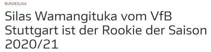 直播车讯北京时间5月18日,德甲联赛官方宣布,斯图加特边锋瓦曼吉图卡当选赛季最佳新秀。