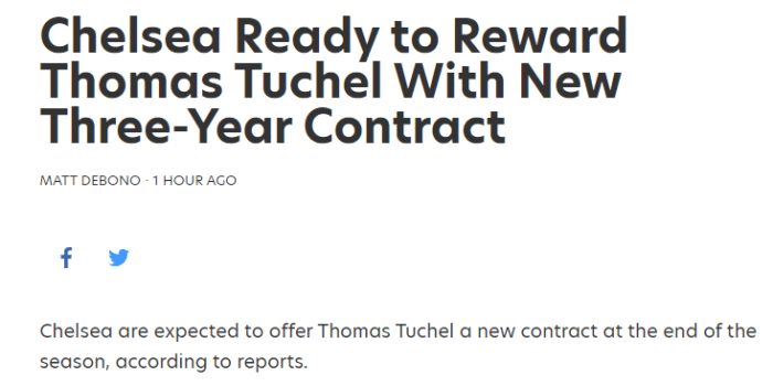 直播车讯 图赫尔接替兰帕德时,签订了一份18个月的短合同。本赛季他率队晋级足总杯和欧冠决赛,联赛前四也基本锁定了。