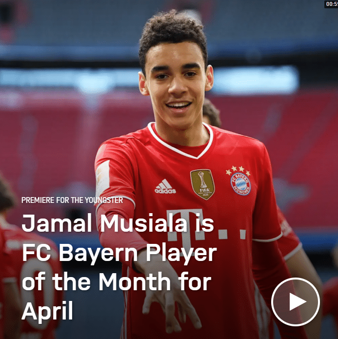 官方: 小将穆西亚拉当选拜仁4月队内最佳