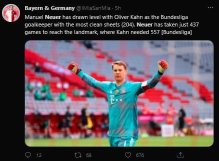 根据数据统计显示,本场比赛是诺伊尔在德甲的第204场零封,追平了卡恩创下的德甲纪录,两个人目前都是204次零封。诺伊尔只花了437场联赛便解锁了此成就,比卡恩少用了120场比赛。