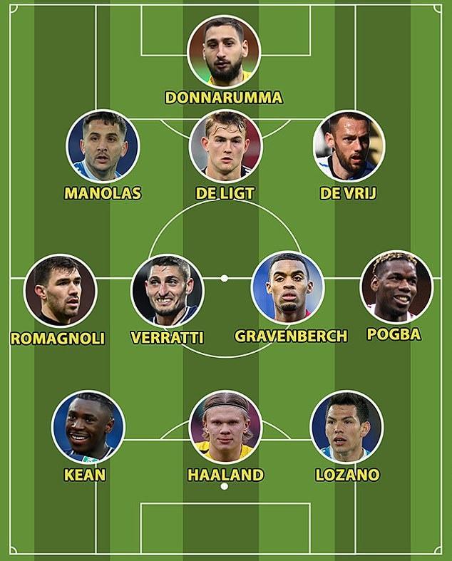 前锋:洛萨诺(那不勒斯)、小基恩(巴黎圣日耳曼)、哈兰德(多特蒙德)
