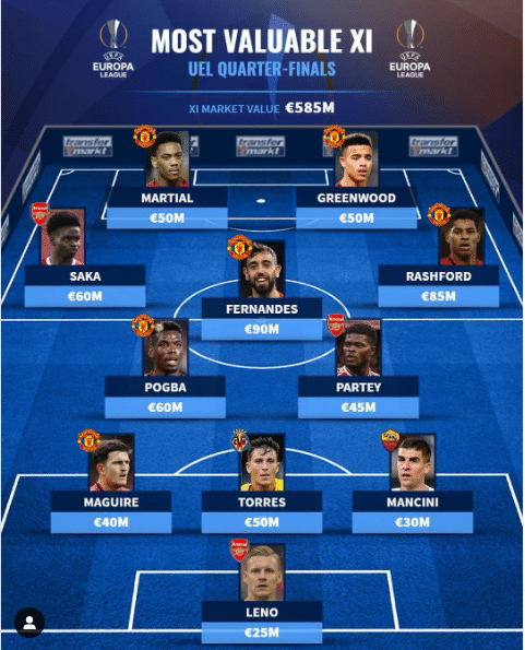 直播车讯,德国转会市场评选出欧联杯八强最贵阵容,曼联6人入选,阿森纳3人入选。