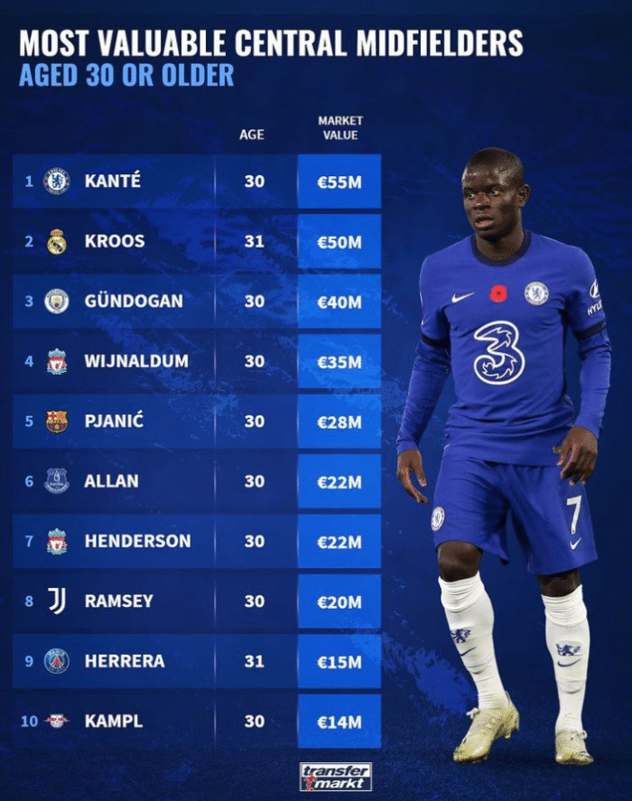 德转评30+岁最贵中场: 坎特领衔, 克罗斯第二