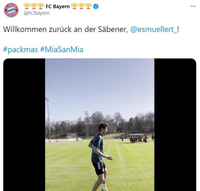 官方发布了一段短视频,视频中显示,穆勒已经从新冠肺炎中康复,并解除隔离,他出现在训练场上与体能教练布莱奇一起训练。