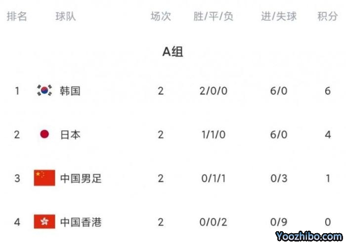 直播车07月25日讯 东亚杯次轮比赛全部结束,中国男足0-0日本男足,韩国男足3-0中国香港男足。