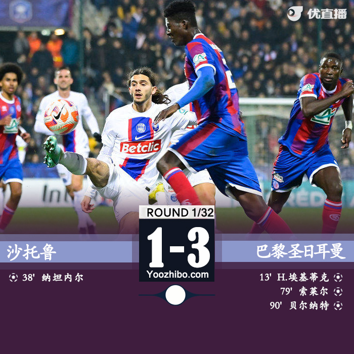 直播车讯北京时间1月7日凌晨4:00,法国杯1/32决赛,沙托鲁对阵巴黎圣日耳曼。上半场,加尔比助攻埃基蒂克破门,恩托拉扳平比分。下半场,索莱尔破门再次为巴黎取得领先!巴黎圣日耳曼3-1沙托鲁晋级下一轮!