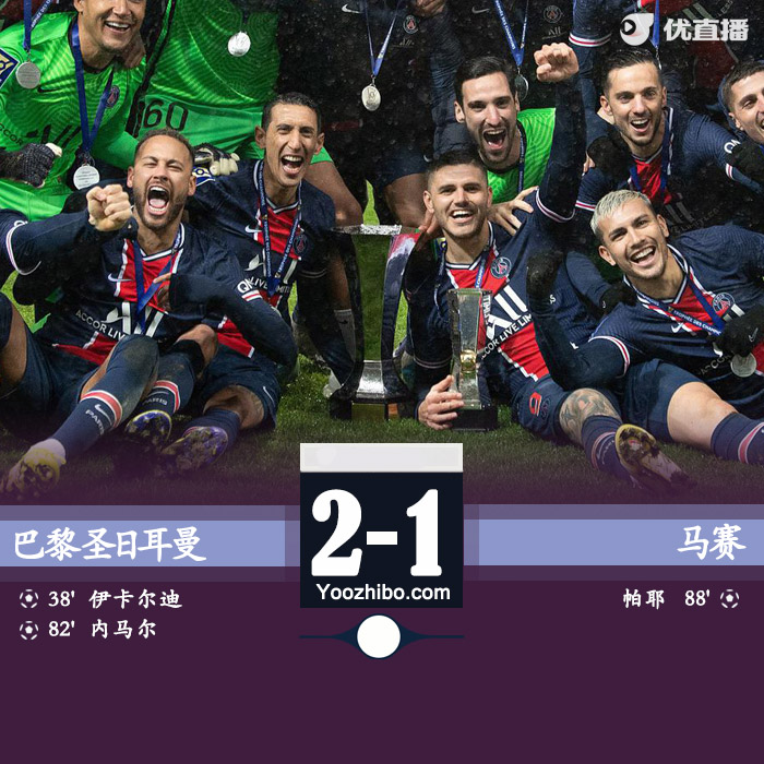 直播车1月14日讯 北京时间1月14日4:00,法国超级杯决赛打响,巴黎圣日尔曼迎战马赛。上半场,伊卡尔迪、姆巴佩接连越位进球被吹,伊卡尔迪打破僵局后又击中横梁。下半场,内马尔复出登场点球建功,帕耶扳回一球。全场比赛结束,巴黎2-1战胜马赛,连续八年夺得法国超级杯。