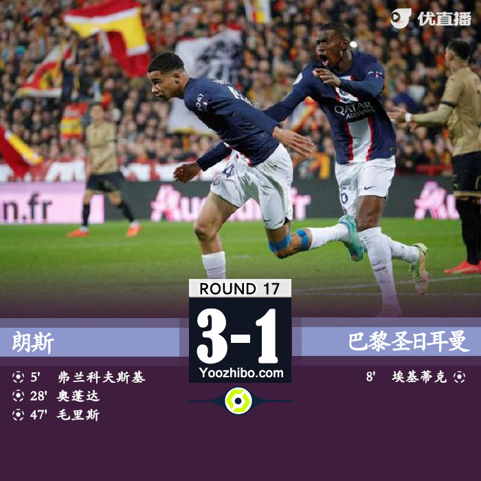 直播车讯 北京时间1月2日凌晨3:45,2022-23赛季法甲联赛第17轮,巴黎圣日耳曼客战朗斯。上半场弗兰科夫斯基破门,埃基蒂克闪电扳平,随后奥蓬达助朗斯再次领先;下半场奥蓬达助攻毛里斯进球,最终巴黎圣日耳曼1-3不敌朗斯,遭遇本赛季联赛首败。