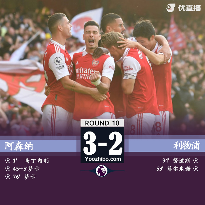 直播车讯北京时间10月9日23点30分,英超第10轮焦点战阿森纳主场对阵利物浦。上半场开场1分钟马丁内利闪击破门,努涅斯铲射扳平比分,迪亚斯伤退,萨卡补时阶段打进一球。下半场,厄德高错失良机,菲尔米诺再度扳平比分,热苏斯造点,萨卡点射破门,全场比赛结束,阿森纳3-2利物浦。