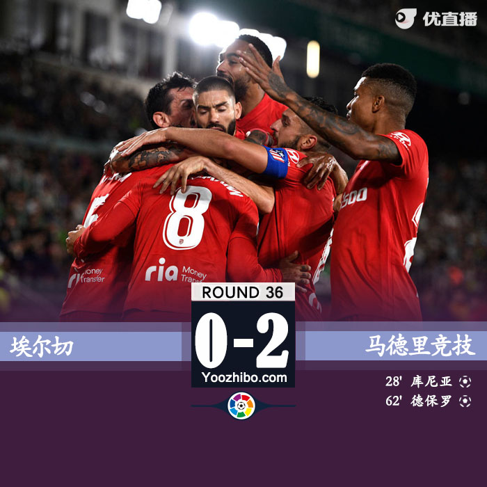 直播车讯5月12日讯北京时间5月12日3:30,西甲联赛第36轮马德里竞技客场挑战埃尔切。上半场洛迪助攻库尼亚打破僵局。下半场格里兹曼助攻德保罗扩大比分,苏亚雷斯破门被吹。全场比赛结束,埃尔切0-2马竞,由于塞维利亚战平马洛卡,马竞升至第三!马竞锁定前四,获得下赛季欧冠资格。