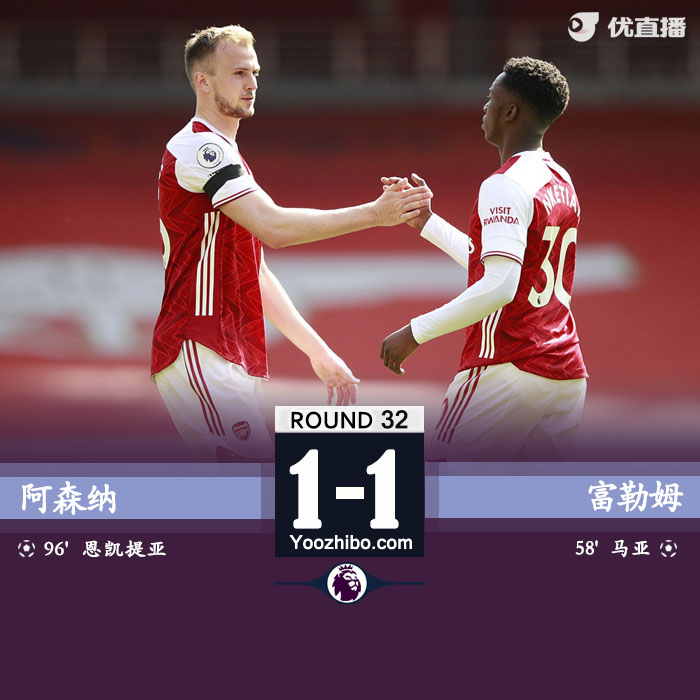 直播车讯 北京时间4月18日晚上20:30,2020-21赛季英超第32轮,阿森纳主场迎战富勒姆。上半场,马丁内利屡失良机,塞巴略斯进球越位。半场战罢,阿森纳暂0-0富勒姆。下半场,加布里埃尔送点,马雅点射命中,拉卡泽特伤退,恩凯提亚读秒绝平。全场结束,阿森纳1-1富勒姆,距离欧冠区9分。