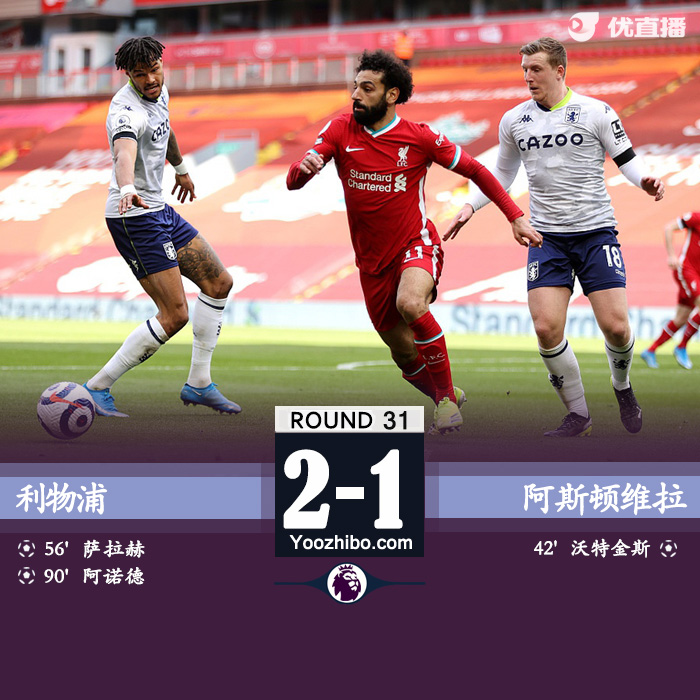 直播车4月10日讯 北京时间4月10日晚22:00,英超第31轮继续进行,利物浦坐镇主场迎战阿斯顿维拉。上半场,萨拉赫单刀打偏,菲尔米诺破门但若塔体毛越位在先,进球无效。下半场,萨拉赫补射空门扳平,特雷泽盖外脚背击中立柱,阿诺德禁区外远射绝杀。全场比赛结束,利物浦2-1战胜阿斯顿维拉,上升至积分榜第四位。