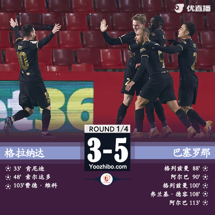 直播车2月4日讯 北京时间2月4日凌晨4点整,2020-21赛季西班牙国王杯1/4决赛展开角逐,巴塞罗那客场挑战格拉纳达。上半场乌姆蒂蒂失误送礼,肯尼迪首开纪录,下半场索尔达多单刀破门,罗贝托伤退,巴萨三中框,格列兹曼和阿尔巴扳平比分。加时赛格列兹曼、德容和阿尔巴先后破门,最终巴塞罗那客场5-3战胜格拉纳达,巴萨晋级国王杯四强。