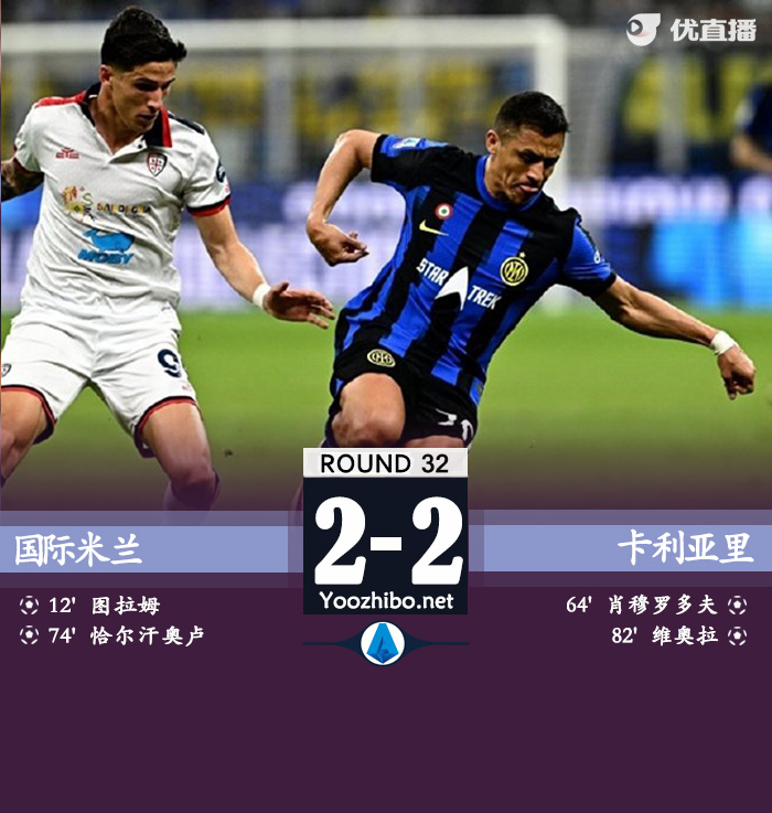 直播车讯:北京时间4月15日,意甲第32轮,国米主场迎战卡利亚里。上半场,桑切斯助攻图拉姆先拔头筹,巴雷拉头球吊射破门越位在先被吹。易边再战,肖穆罗多夫破门,恰尔汗奥卢点射再次超出比分,维奥拉再次帮助客队扳平,拉帕杜拉手球助攻引争议。最终国米2-2卡利亚里。积分榜方面,国米26轮不败14分领跑,卡利亚里31分第14。