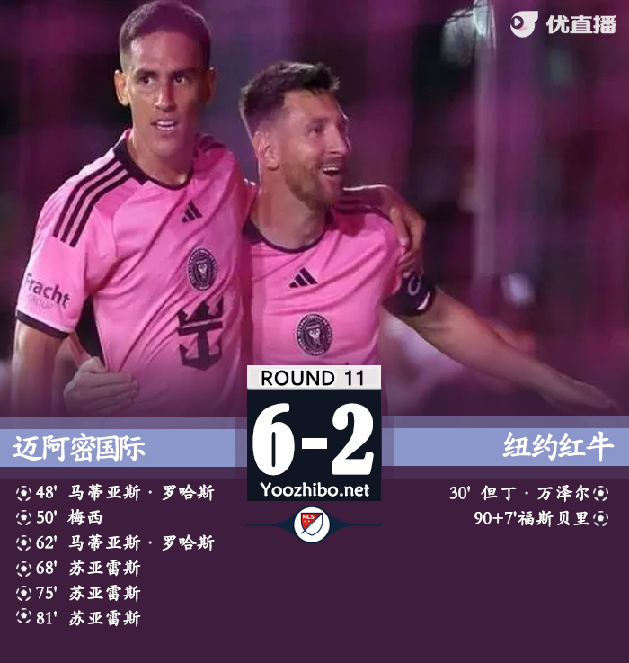 直播车讯:北京时间5月5日7点30分,美职联第11轮迈阿密国际主场迎战纽约红牛。上半场,迈阿密占据优势多次施压,范泽尔补射破门,阿伟莱斯头球中框。下半场,罗哈斯替补完成双响,梅西进球后苏亚雷斯带帽。全场比赛结束,迈阿密国际6-2纽约红牛。梅西本场比赛完成破门后本赛季11场比赛打进12球,联赛8场10球领跑MLS射手榜,近4场连续破门。