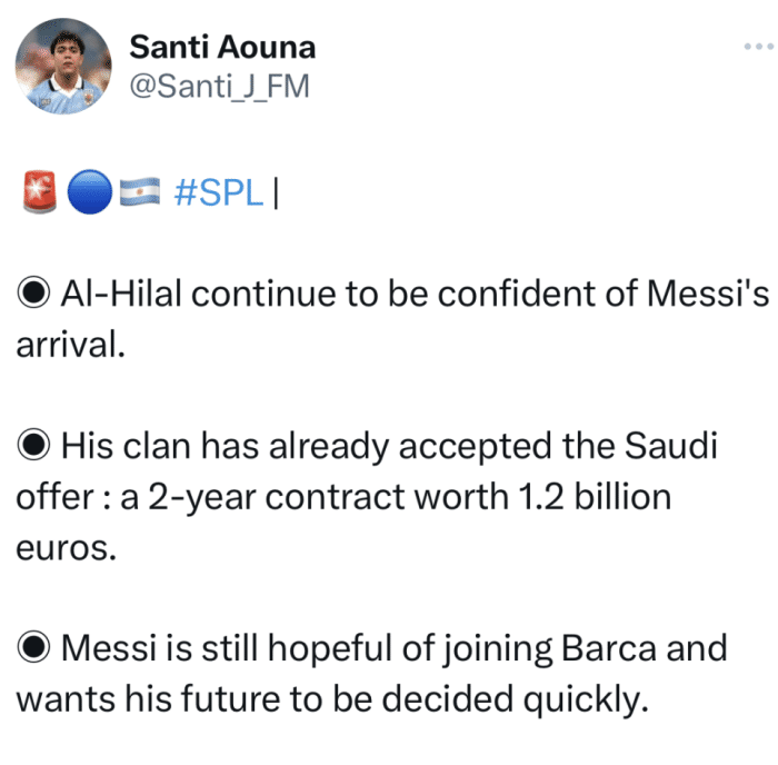 来源:直播车06-05 16:10直播车讯06月05日在大巴黎官宣梅西合同到期自由身离队后,阿根廷球王下一站去哪,无疑是全世界球迷关注的焦点,而实际上关于梅西的竞购战早已经悄悄打响。北京时间6月4日凌晨,来自法国知名记者Santi Aouna的最新消息,尽管梅西还没有决定未来,但利雅得新月俱乐部却对签下他信心十足。