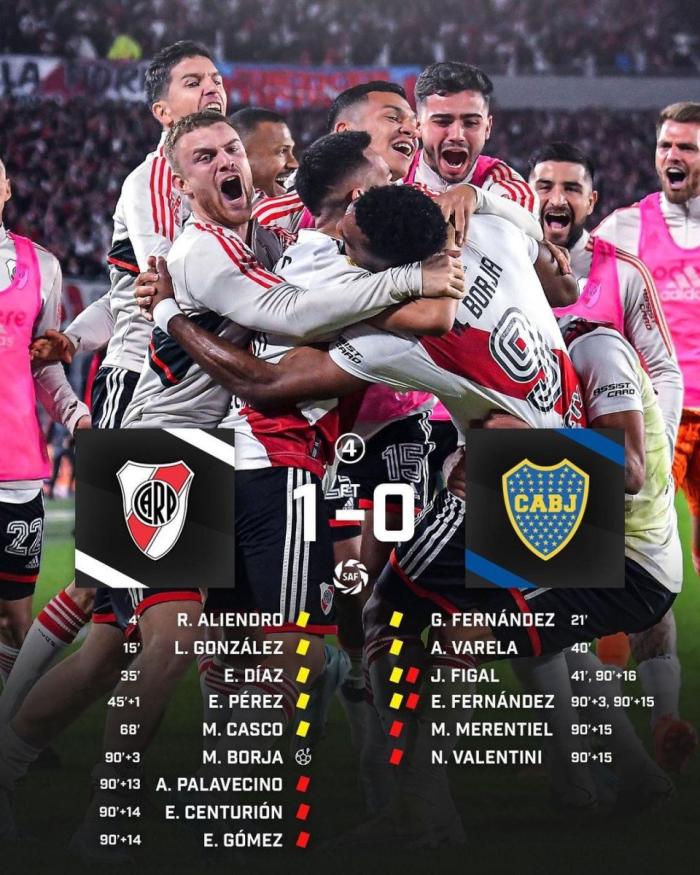 主裁判罚下了博卡青年球员埃塞基耶尔-费尔南德斯、尼古拉斯-瓦伦蒂尼和梅伦铁尔、博卡主教练豪尔赫-阿尔米隆,以及河床队球员帕拉韦西诺、森图里翁、埃利亚斯-戈麦斯。