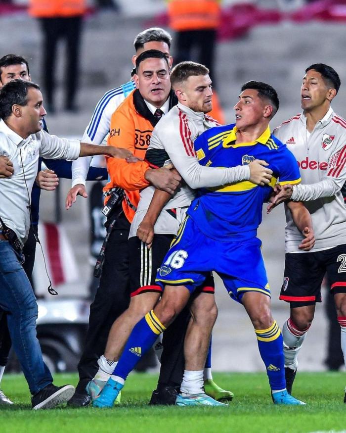 上半场主队河床就有4人吃到黄牌,而博卡也有3人染黄。到了下半场补时阶段,当主队河床获得点球机会并且由米格尔博尔哈主罚命中后,双方的“火药桶”彻底被点燃。