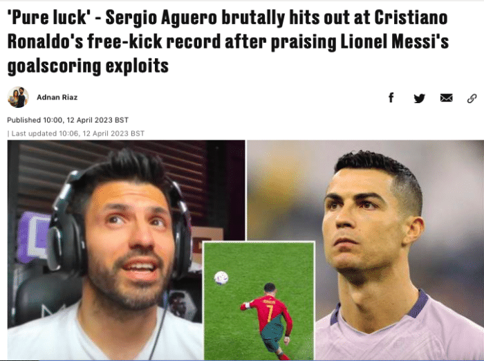 阿圭罗看低C罗:任意球纯靠蒙!在皇马都有2人比他强,梅西全在找角度