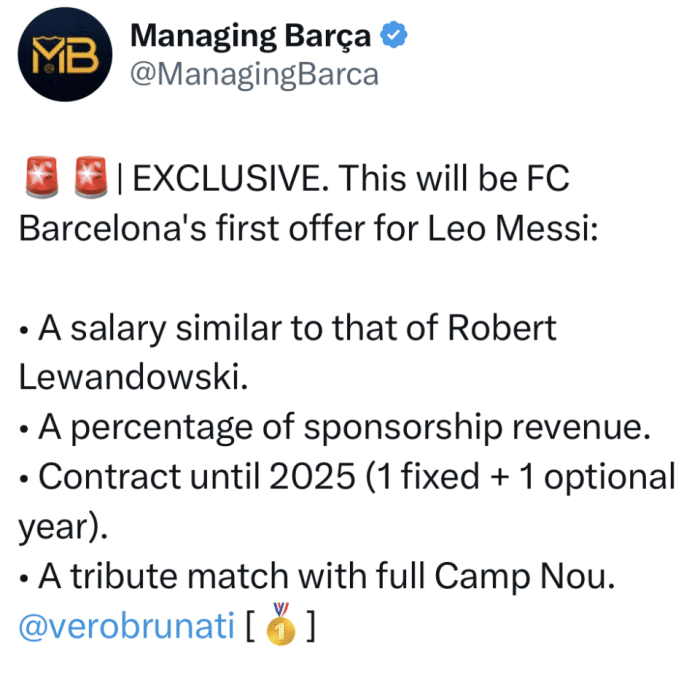 根据Veronica Brunati的透露,巴萨开出的首份报价主要有以下几方面的核心内容。首先,他们计划与梅西签订一份“1+1”年限的合同,梅西回归后有望效力到2025年。其次,梅西回归后的年薪将会与巴萨目前的头牌球星莱万看齐。目前波兰射手在巴萨税后年薪,约为900万欧元。