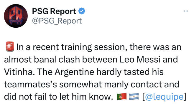 来源:直播车02-24 21:44直播车讯02月24日,法国知名媒体《队报》透露,在巴黎圣日耳曼最近的训练课上,梅西与葡萄牙国脚维蒂尼亚发生了小冲突(clash)。