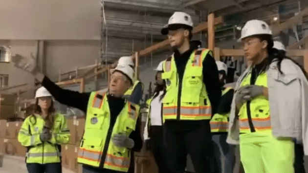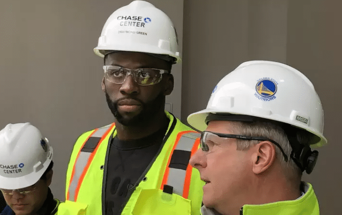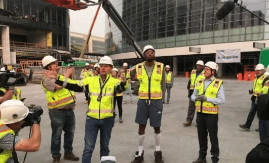 勇士核心库里来到建设的新球场参观考察;