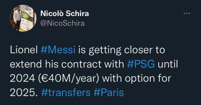 斯基拉表示,梅西越来越接近与巴黎续约至2024年,续约后阿根廷人的年薪将达到4000万欧元,合同中包含一年续约选项。