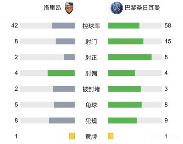 全场比赛结束,最终巴黎圣日耳曼2-1洛里昂。